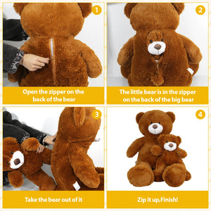- UNIQUE DESIGN: 2-in-1 teddy bear set featuring a large 33.4-inch plush with a hidden zippered compartment that stores a matching 17.7-inch smaller bear
