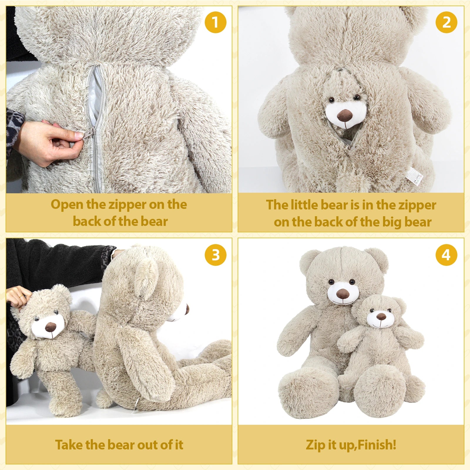 - UNIQUE DESIGN: 2-in-1 teddy bear set featuring a large 33.4-inch plush with a hidden zippered compartment that stores a matching 17.7-inch smaller bear