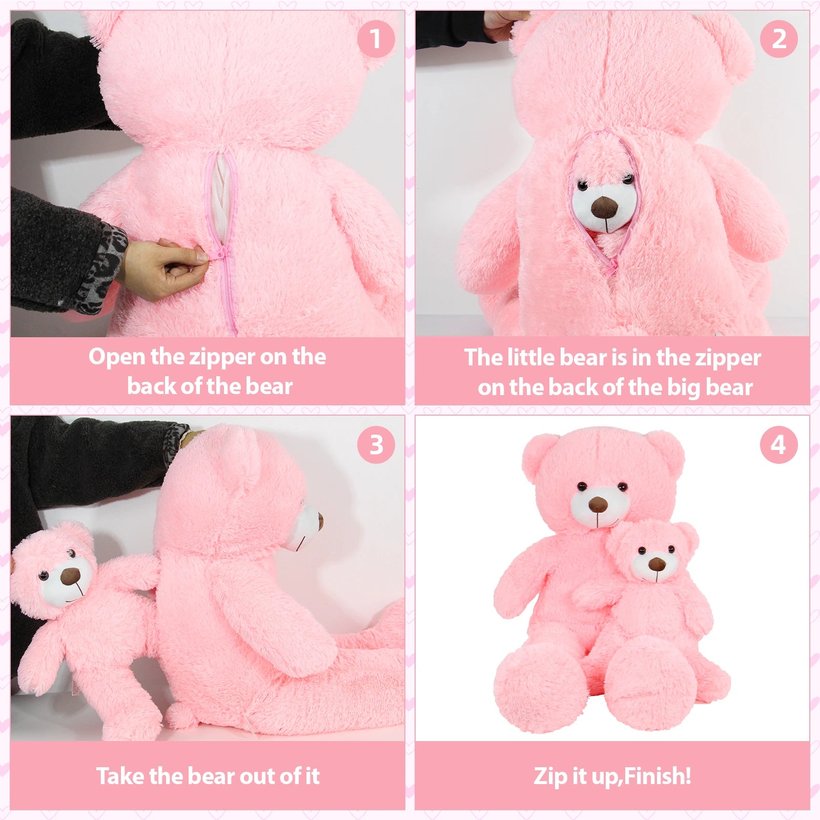 • UNIQUE DESIGN: 2-in-1 teddy bear set featuring a large 33.4-inch plush with a hidden zippered compartment that stores a matching 17.7-inch smaller bear